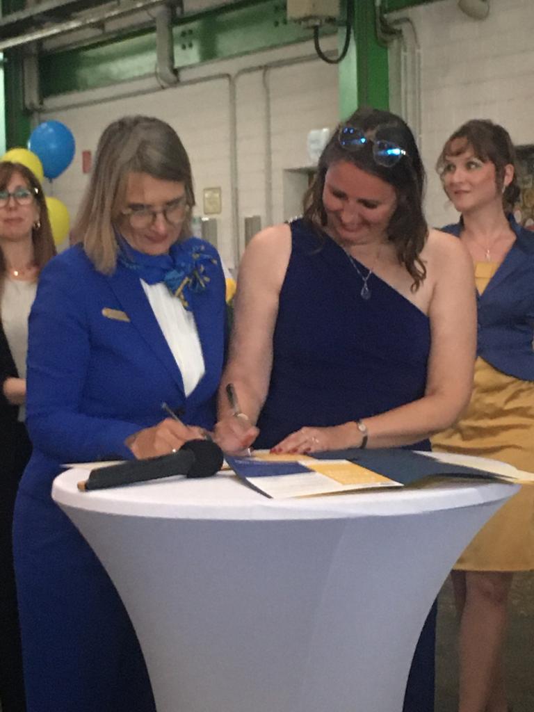 Op zaterdag 21 mei vierde SI Club Düsseldorf-Königsallee haar tiende verjaardag. Het feest vond plaats in een industriële entourage: de hal van een fabriek waar hijskranen worden gemaakt. Ter beschikking gesteld door de eigenares, een Soroptimist! Onder de gasten was een delegatie van Club Rotterdam. Tijdens de feestelijke avond met live muziek, een heerlijk diner en heel veel toespraken ondertekende Danielle Vissers namens Club Rotterdam de Friendshiplink!