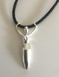 De powervrouw-hanger in zilver is 4 cm lang, 2 cm breed en 1 cm dik; het gewicht is 10 gram. Er wordt een zwart koord bij geleverd.