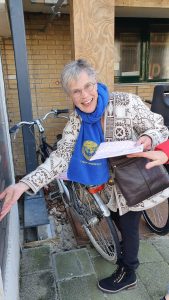 Foto: Lenie bezorgt een mooi verpakte glossy bij een Nieuwegeinse inwoonster.