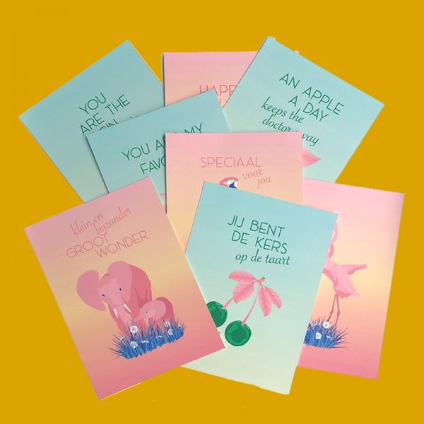 Een set van 8 verschillende ansichtkaarten te gebruiken bij diverse gelegenhedden. Zo heb je dus altijd een kaart om te versturen in huis. De kaarten zijn een uniek ontwerp van Desiree Kramer. De opbrengst komt ten goede aan Vluchtelingenwerk Vught. Dankzij jouw bijdrage kunnen nieuwkomers in Vught met een achtergrond als vluchteling begeleid leren fietsen.