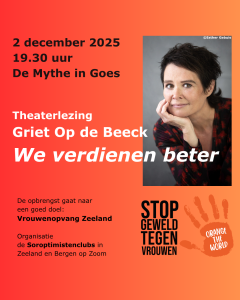 Een avond vol betrokkenheid Na afloop van de theaterlezing werd de cheque officieel overhandigd. Bezoekers konden in de foyer boeken van Griet Op de Beeck aanschaffen – die zij persoonlijk signeerde – en producten kopen waarvan de opbrengst eveneens naar het goede doel ging. De Soroptimistenclubs spreken van een “bijzondere en waardevolle avond, waarin bewustwording en concrete steun samenkwamen”.