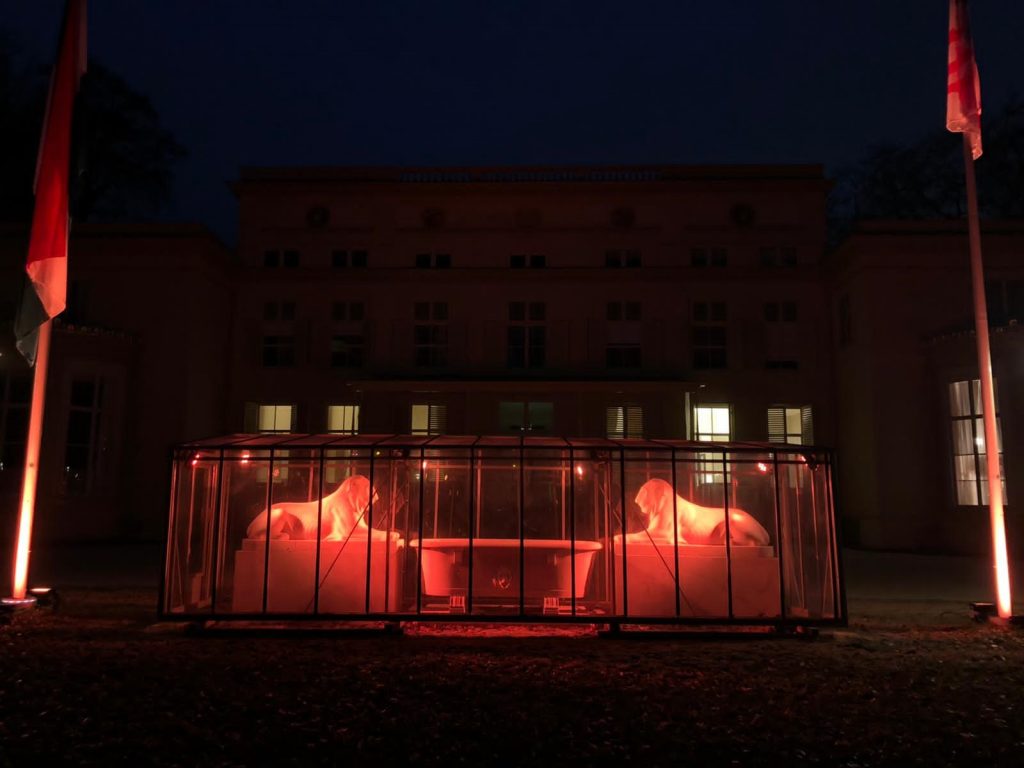 De Leeuwen voor Huize de Paauw te Wasseaar waren tot 10 december (2020), Dag van de rechten van de mens, elke avond oranje gekleurd als een statement tegen geweld tegen vrouwen en meisjes, in Nederland en de rest van de wereld.