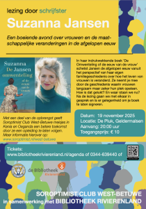 Op 19 november neemt bestseller schrijfster Suzanna Jansen ons mee op een reis door de tijd. Vanuit het perspectief van haar moeder, haar zus en haar zichzelf vertelt ze over de geschiedenis en de maatschappelijke ontwikkeling van de vrouw in Nederland.