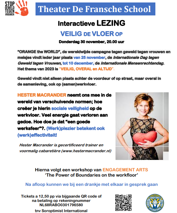 In en met ons prachtige theater de Fransche School organiseert Club West Betuwe een inspirerende avond over verbindende communicatie, verzorgd door de bekende cabaratiere en oud soroptimist Hester Macrander, passend bij het OtW thema ‘Veilig , overal en altijd’.
