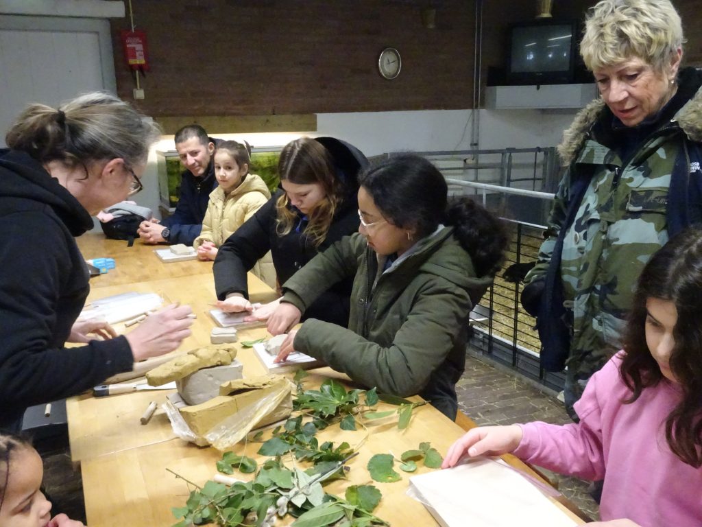 Na de boomplant verzorgde keramiste Ingrid Mol in de grote stal een workshop voor kinderen (en hun ouders) om van klei een afdruk van een blad te maken als bedeltje. Ze konden kiezen uit witte of gele klei en uit een aantal verschillende bladeren. Leuk hoe heel jonge kinderen en ook pubers ermee aan de slag gingen.