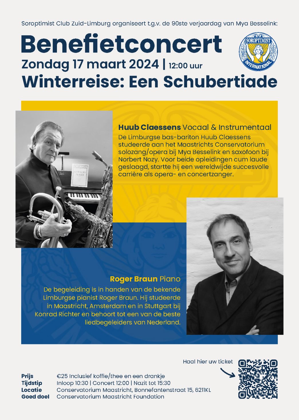 Winterreise: ein Schubertiade | 17 maart 2024 Winterreise: een Schubertiade Winterreise: ein Schubertiade | 17 maart 2024 Op 17 maart 2024 organiseren wij een benefiet concert voor de 90e verjaardag van Mya Besselink. De opbrengst gaat naar de Conservatorium Maastricht Foundation. Prijs: €25 Inclusief koffie/thee en een drankje Tijdstip: Inloop 10:30 | Concert 12:00 | Nazit tot 15:30 Lokatie: Conservatorium Maastricht, Bonnefantenstraat 15, 6211KL Scan de QR code voor tickets! Benefietconcent Winterreise: ein Schubertiade 17 maart 2024